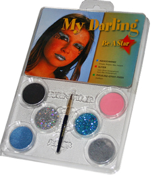 Schminkpalette für das My DarlingDie Palette beinhaltet folgendes:3 Farben, 2 Glitzer, 1 Puder, 1 Pinsel 3x 3,5ml Farbe (Schwarz [111], Perlglanz-Blau [035], Hellpink [588]), 2x Polyester-Glitzer (Juwel-Glitzer (holographisch), Juwel-Blau [holographisch]). 1x Perlglanz-Effekt-Puder (CoolPlatin).