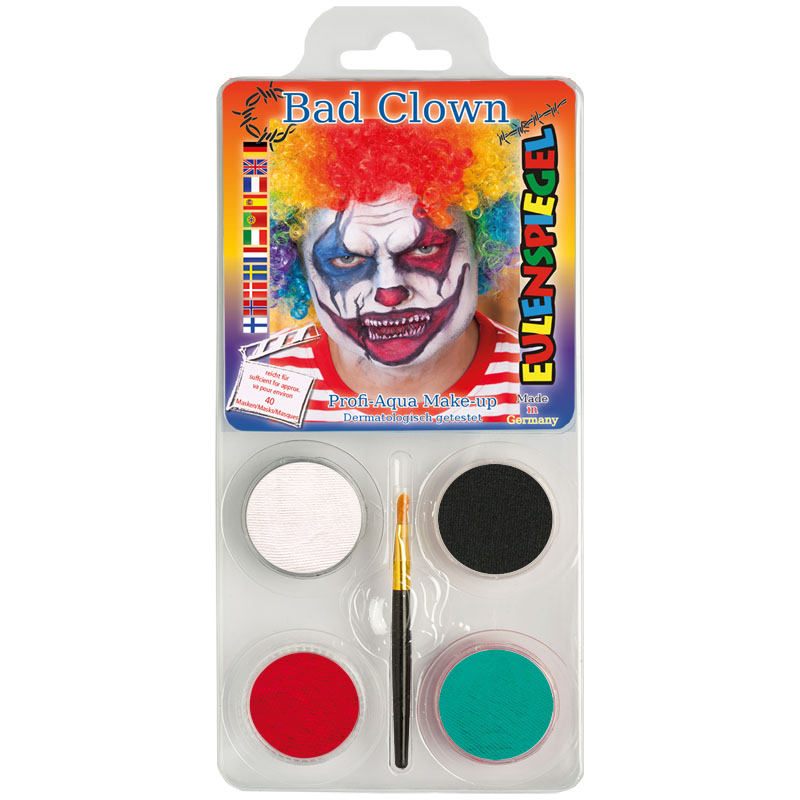 Bad ClownDas Motiv-Set reicht für circa 40 Masken. Es besteht aus vier Eulenspiegel-Farben, einem Pinsel sowie einer vollständigen Anleitung in Schritt-für-Schritt-Darstellung. Inhalt: 20 ml in der Farbe: Weiß, Schwarz, Rubinrot und Lagunenblau 1 Schminkpinsel Original Eulenspiegel Schminkanleitung.