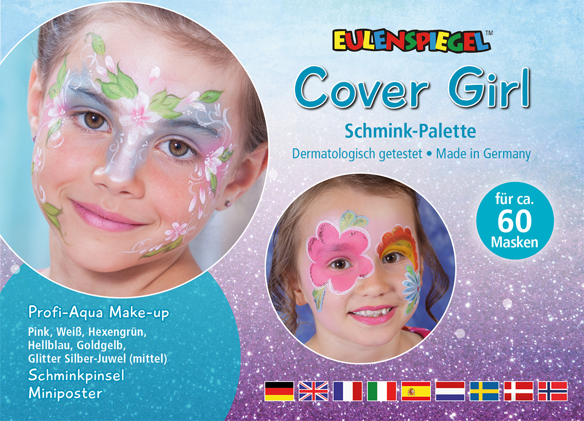 Schminkpalette für das Motto Cover Girl Die 6 Farben-Palette reicht für circa 60 Masken. Die Palette besteht aus sechs Eulenspiegel-Farben bzw. Glitzer/Puder (á 3,5 ml), einem Pinsel sowie einer vollständigen Anleitung in Schritt-für-Schritt-Darstellung für die jeweiligen Motive.Die Palette beinhaltet die Farben Weiß Pink Hexengrün Hellblau Goldgelb sowie den Glitzer Silber-Juwel (mittel)