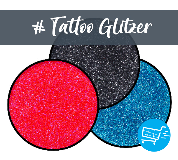 Hier finden Sie Farben, Glitzer und Zubehör für unsere Glitzer- und Paintedtattoos.
